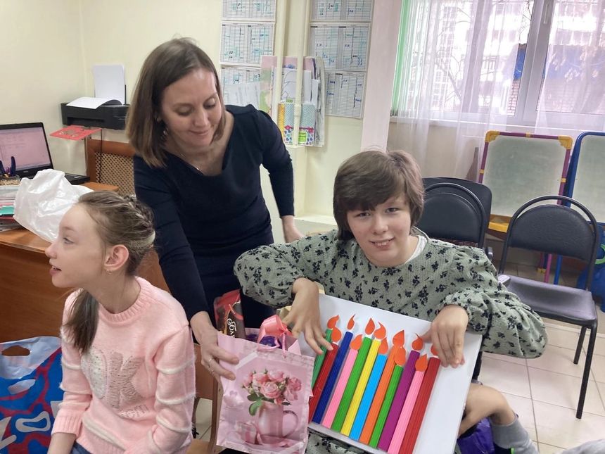Под руководством Елены Евгеньевны, ребята сделали замечательный подарок имениннице - яркую, красочную картину со свечами, в которых" спрятались" тёплые пожелания друзей.